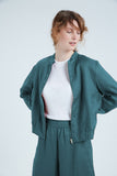 100% Linen bomber jacket in sage green colour featuring a metal zip, front welt pockets and fully lined. Throw over tees, shirts and dresses for a light-weight outer layer. See sizing notes for fit details.